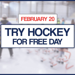 The next Try Hockey For Free Day is scheduled for February 20. For a listing of participating rinks, visit: https://www.tryhockeyforfree.com/